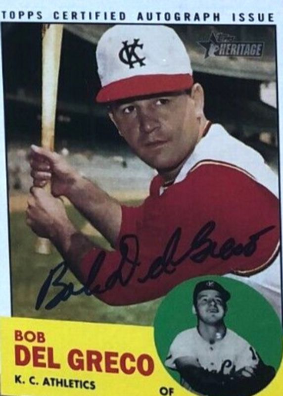 This card is 1 of 3 Bob Del Greco's card variations in the 2012 Topps Heritage set being tracked by Sports Card Investor, including 50th Anniversary Buybacks, and Real One Autographs - Red Ink /63.