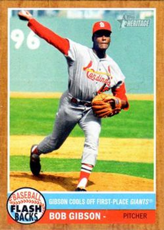 The Bob Gibson 2011 Topps Heritage #BF-10 Baseball Flashbacks card is 1 of 5 Bob Gibson's card variations in the 2011 Topps Heritage set being tracked by Sports Card Investor, including Flashback Stadium Relic Autographs, Real One Autographs, Real One Autographs - Red Ink /62, and Clubhouse Collection Relic Autographs /25.