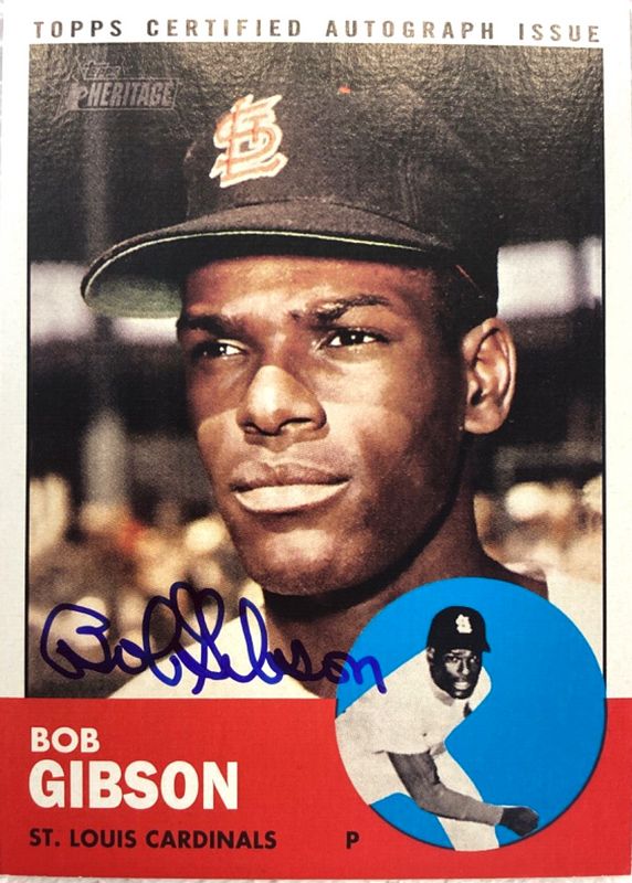 This card is 1 of 7 Bob Gibson's card variations in the 2012 Topps Heritage set being tracked by Sports Card Investor, including 50th Anniversary Buybacks, 63 Mint, Flashback Stadium Relics, Real One Autographs - Red Ink /63, and Flashback Autographs /25.