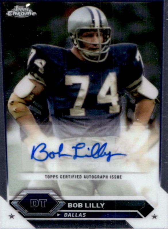 Bob Lilly's Football cards are available in at least 88 sets. Bob Lilly's biggest 7-day price movers are 2023 Topps Composite #TCA-BL Chrome Autographs, 2023 Topps Composite #TCA-BL Chrome Autographs - Red Wave Refractor /5, and 2024 Topps Finest #FBA-BL Flashback Autographs - Superfractor /1.