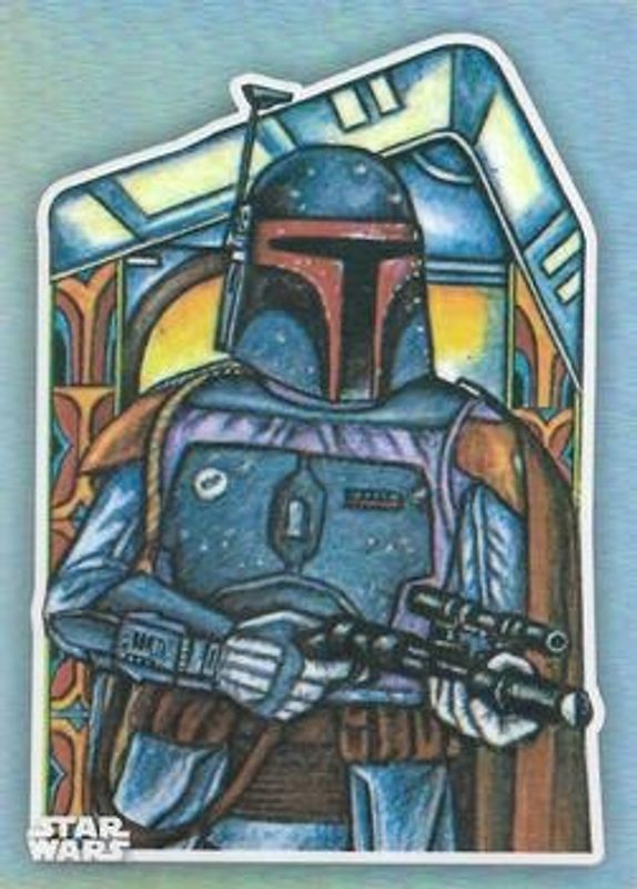 The Boba Fett 2023 Topps Chrome Star Wars #ROJ40-2 Return of the Jedi 40th Anniversary Poster Art card is 1 of 17 Boba Fett's card variations in the 2023 Topps Chrome Star Wars set being tracked by Sports Card Investor, including Base, Black Wave, Purple Wave, Refractor, and Aqua /199.