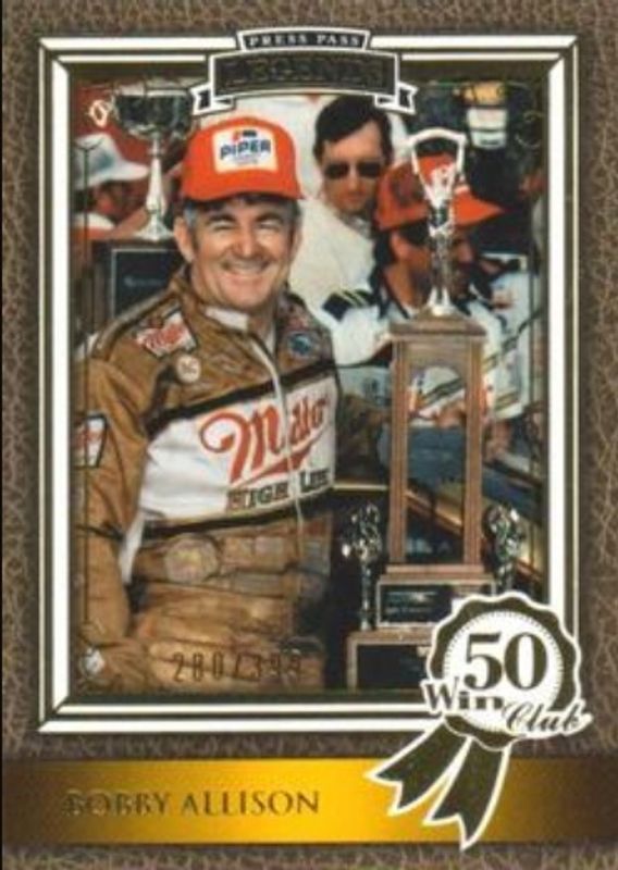 The Bobby Allison 2010 Press Pass Legends #63 Gold /399 card is 1 of 52 Bobby Allison's card variations in the 2010 Press Pass Legends set being tracked by Sports Card Investor, including #1 Base, #63 Base, #1 Gold /399, #63 Red /199, and #1 Red /199.