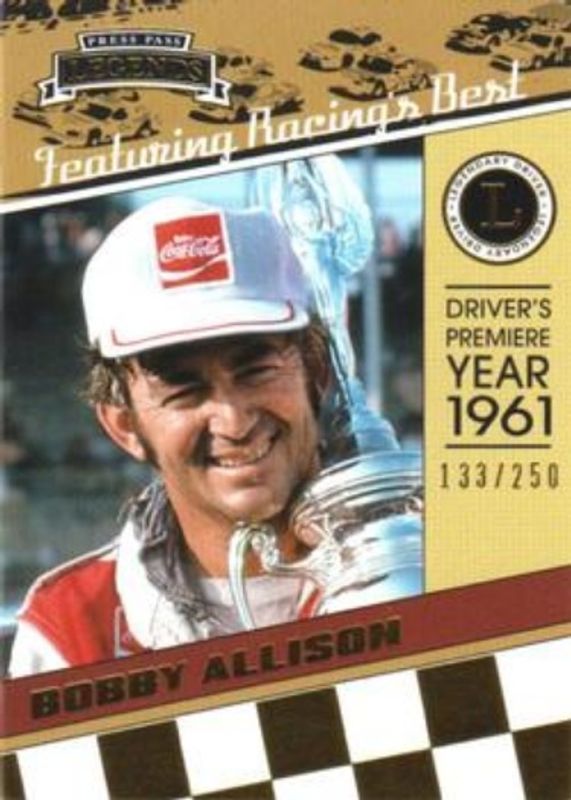 The Bobby Allison 2011 Press Pass Legends #1 Gold /250 card is 1 of 77 Bobby Allison's card variations in the 2011 Press Pass Legends set being tracked by Sports Card Investor, including Base, League Leaders, Rated Rookie, League Leaders - Gold /250, and Rated Rookie - Gold /250.