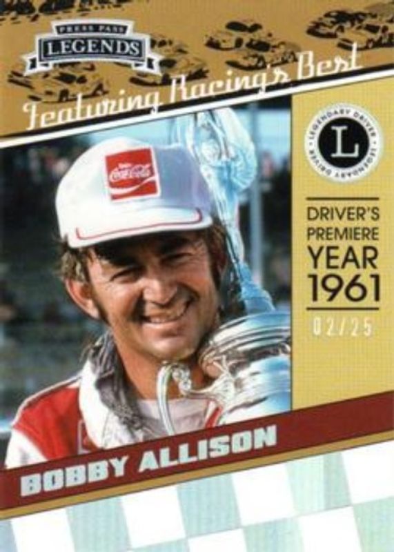 The Bobby Allison 2011 Press Pass Legends #1 Holofoil /25 card is 1 of 77 Bobby Allison's card variations in the 2011 Press Pass Legends set being tracked by Sports Card Investor, including Base, League Leaders, Rated Rookie, Gold /250, and League Leaders - Gold /250.