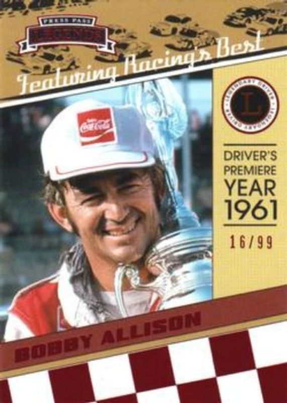 The Bobby Allison 2011 Press Pass Legends #1 Red /99 card is 1 of 77 Bobby Allison's card variations in the 2011 Press Pass Legends set being tracked by Sports Card Investor, including Base, League Leaders, Rated Rookie, Gold /250, and League Leaders - Gold /250.