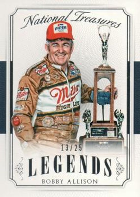 The Bobby Allison 2016 National Treasures NASCAR #43 Base /25 card is 1 of 9 Bobby Allison's card variations in the 2016 National Treasures NASCAR set being tracked by Sports Card Investor, including Century Silver /20, Century Gold /15, Century Black /5, Century Blue /1, and Printing Plates Black /1.