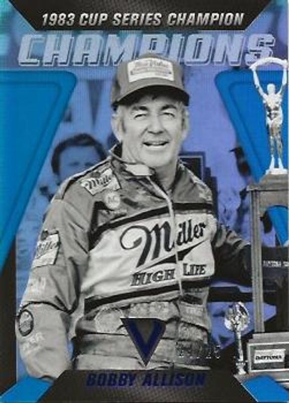 The Bobby Allison 2018 Victory Lane NASCAR #C3 Champions Blue /25 card is 1 of 49 Bobby Allison's card variations in the 2018 Victory Lane NASCAR set being tracked by Sports Card Investor, including #60 Base, #97 Base, #60 Silver, #97 Silver, and #60 Gold /99.