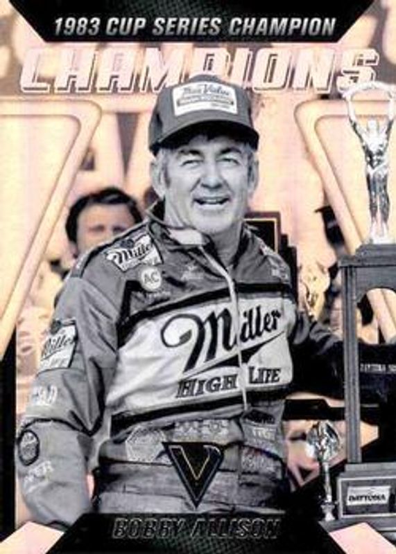 The Bobby Allison 2018 Victory Lane NASCAR #C3 Champions card is 1 of 49 Bobby Allison's card variations in the 2018 Victory Lane NASCAR set being tracked by Sports Card Investor, including #60 Base, #97 Base, #60 Silver, #97 Silver, and #60 Gold /99.
