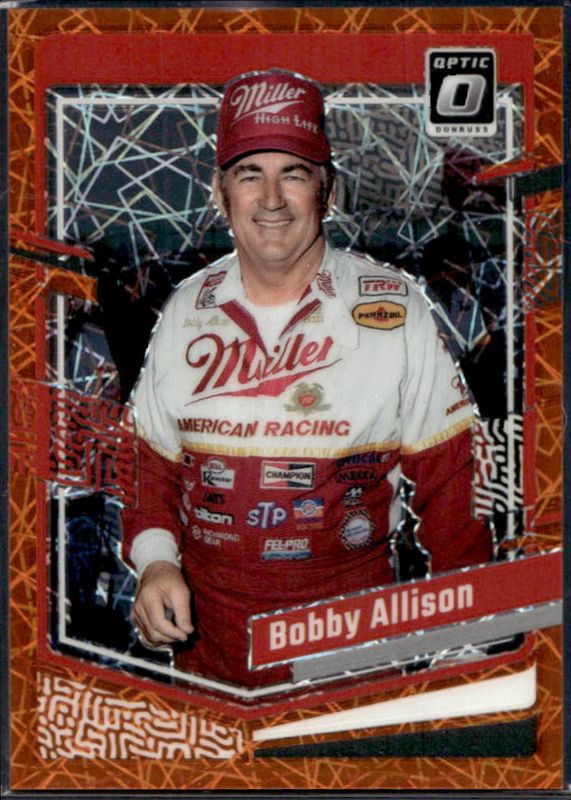 The Bobby Allison 2024 Donruss NASCAR #11 Optic Orange Velocity card is 1 of 31 Bobby Allison's card variations in the 2024 Donruss NASCAR set being tracked by Sports Card Investor, including Base, Optic, Optic Black Pandora, Optic Blue Velocity, and Optic Holo.