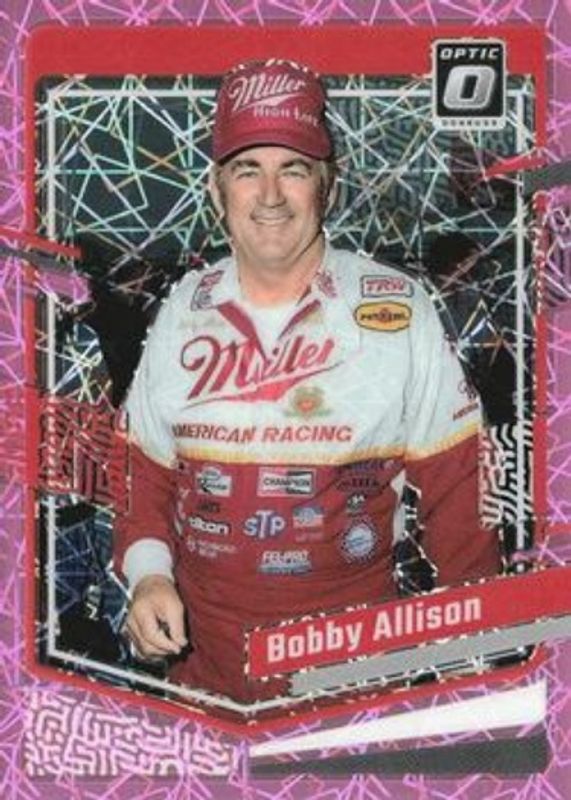 The Bobby Allison 2024 Donruss NASCAR #11 Optic Pink Velocity /79 card is 1 of 31 Bobby Allison's card variations in the 2024 Donruss NASCAR set being tracked by Sports Card Investor, including Base, Optic, Optic Black Pandora, Optic Blue Velocity, and Optic Holo.