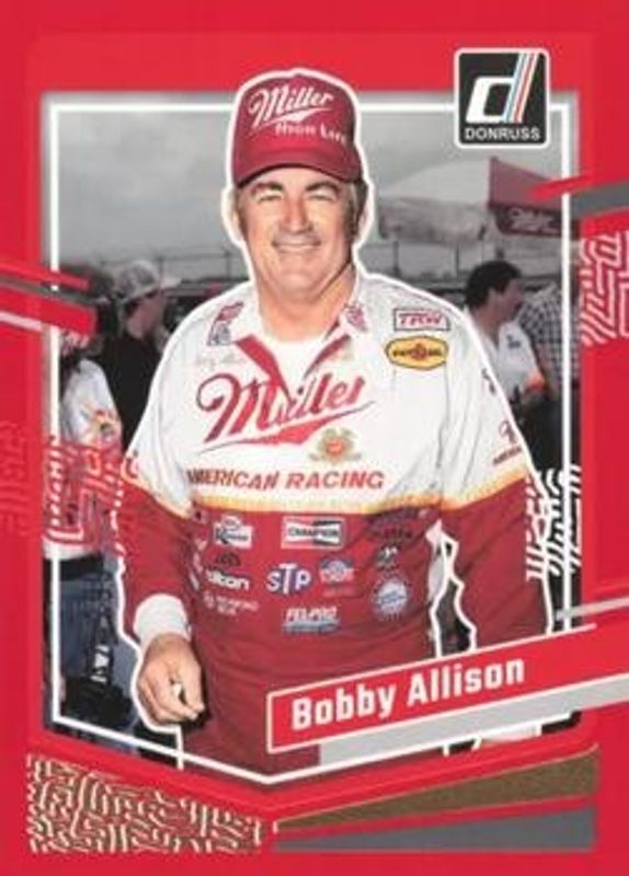 The Bobby Allison 2024 Donruss NASCAR #11 Red /299 card is 1 of 31 Bobby Allison's card variations in the 2024 Donruss NASCAR set being tracked by Sports Card Investor, including Base, Optic, Optic Black Pandora, Optic Blue Velocity, and Optic Holo.