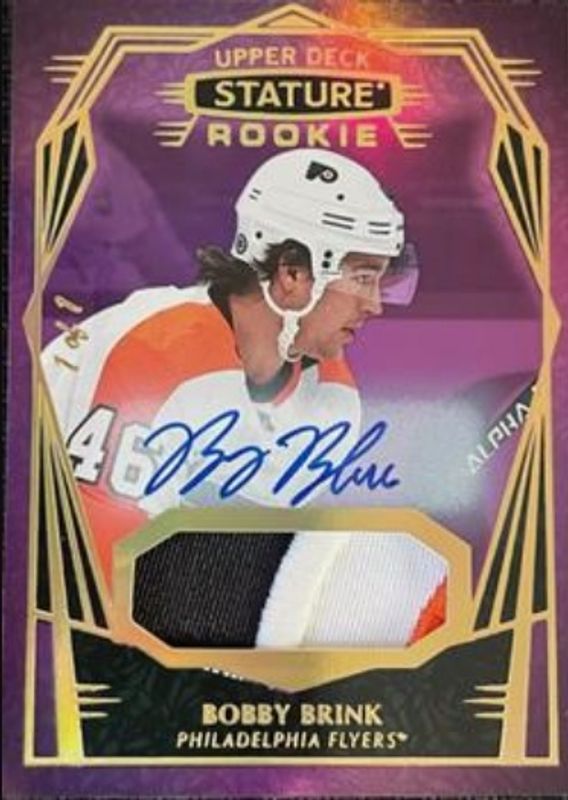 The Bobby Brink 2022 Upper Deck Stature #154 Auto Patch - Design Variant Purple /1 Rookie card is 1 of 43 Bobby Brink's card variations in the 2022 Upper Deck Stature set being tracked by Sports Card Investor, including Base /399, Green /99, Photo Variant /99, Red /75, and Photo Variant Green /66.