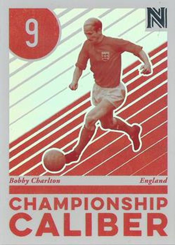 The Bobby Charlton 2017 Nobility #19 Championship Caliber card is 1 of 21 Bobby Charlton's card variations in the 2017 Nobility set being tracked by Sports Card Investor, including Base, Red /199, Blue /99, Orange /75, and Bronze /20.