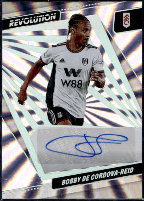 The Bobby De Cordova-Reid 2022 Revolution Premier League #A-BDR Autographs - Sunburst /50 card is 1 of 18 Bobby De Cordova-Reid's card variations in the 2022 Revolution Premier League set being tracked by Sports Card Investor, including Base, Diamond, Disco, Fractal, and Galactic.