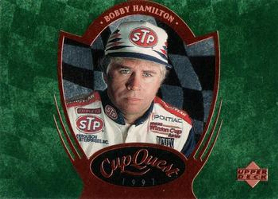 The Bobby Hamilton 1997 Upper Deck Road to the Cup #CQ9 Cup Quest card is 1 of 13 Bobby Hamilton's card variations in the 1997 Upper Deck Road to the Cup set being tracked by Sports Card Investor, including #126 Base, #51 Base, #9 Base, #93 Base, and #+26 Predictor Plus.