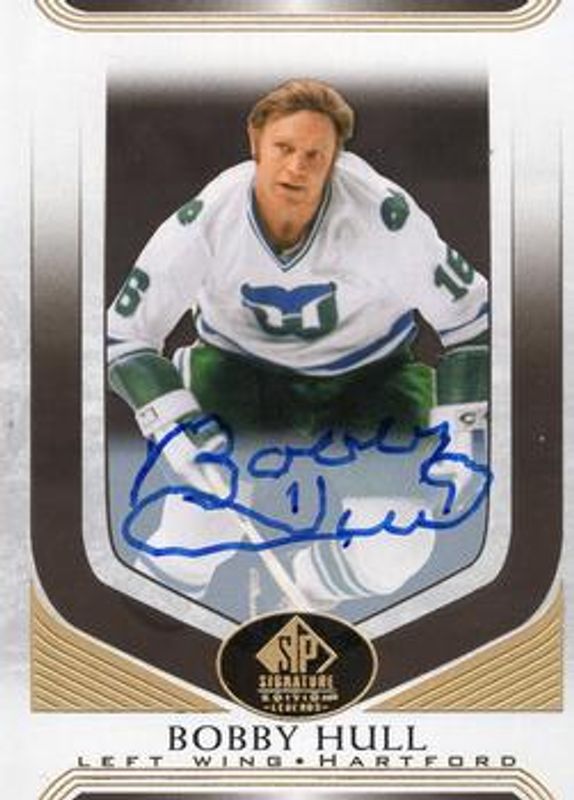 Bobby Hull's Hockey cards are available in at least 211 sets. Bobby Hull's biggest 7-day price movers are 2020 SP Signature Edition Legends #333 Gold Spectrum Foil Autographs /25, 2005 SP Game Used #GG-BH2 Game Gear /100, and 2018 SP Game Used #94 Orange Rainbow /118.