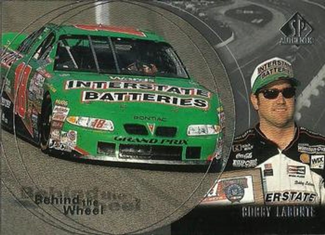 The Bobby Labonte 1998 SP Authentic #BW6 Behind the Wheel card is 1 of 7 Bobby Labonte's card variations in the 1998 SP Authentic set being tracked by Sports Card Investor, including #82 Base, #18 Base, #52 Base, #BW6 Behind the Wheel - Gold, and #BW6 Behind the Wheel Die-Cut /100.
