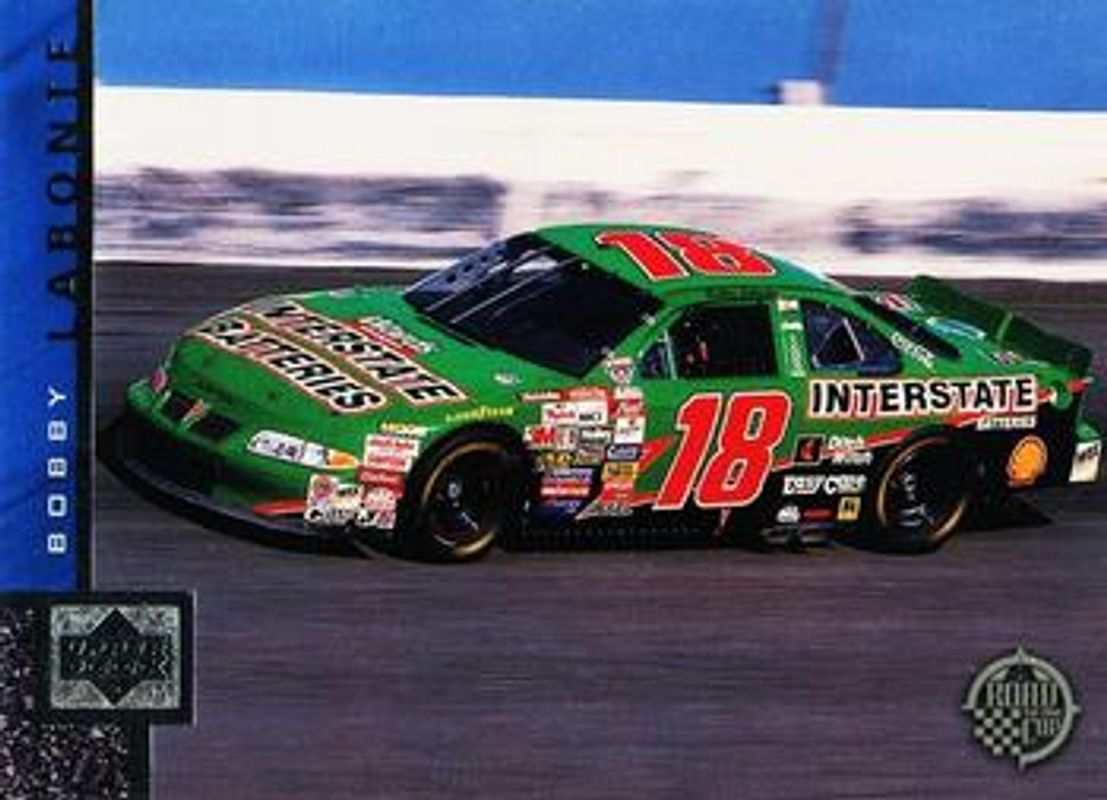 The Bobby Labonte 1998 Upper Deck Road to the Cup #18 Base card is 1 of 8 Bobby Labonte's card variations in the 1998 Upper Deck Road to the Cup set being tracked by Sports Card Investor, including Base, Winning Material, CupQuest Turn 1 /4000, CupQuest Turn 2 /2000, and CupQuest Turn 3 /1000.