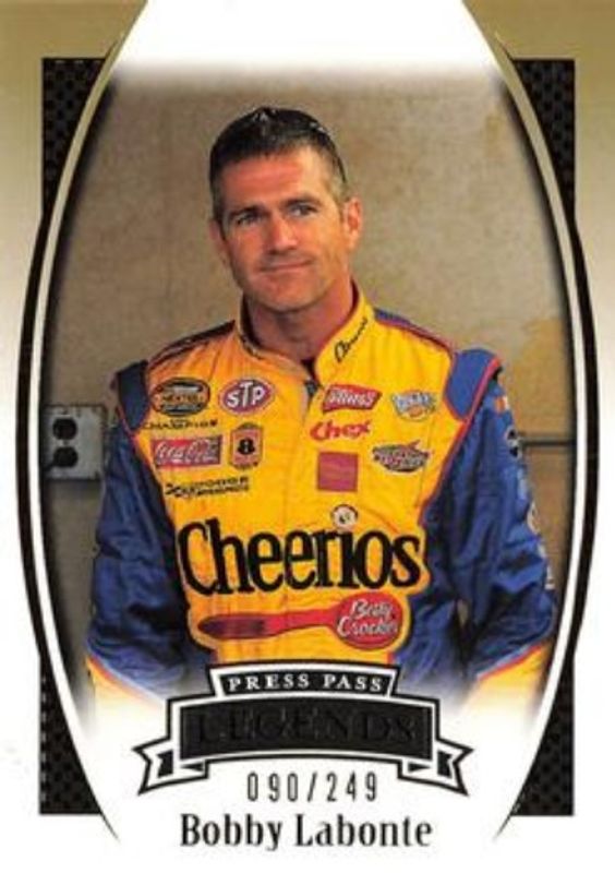 The Bobby Labonte 2007 Press Pass Legends #G-37 Gold /249 card is 1 of 16 Bobby Labonte's card variations in the 2007 Press Pass Legends set being tracked by Sports Card Investor, including Base, Solo, Blue /999, Bronze /599, and Holofoil /99.