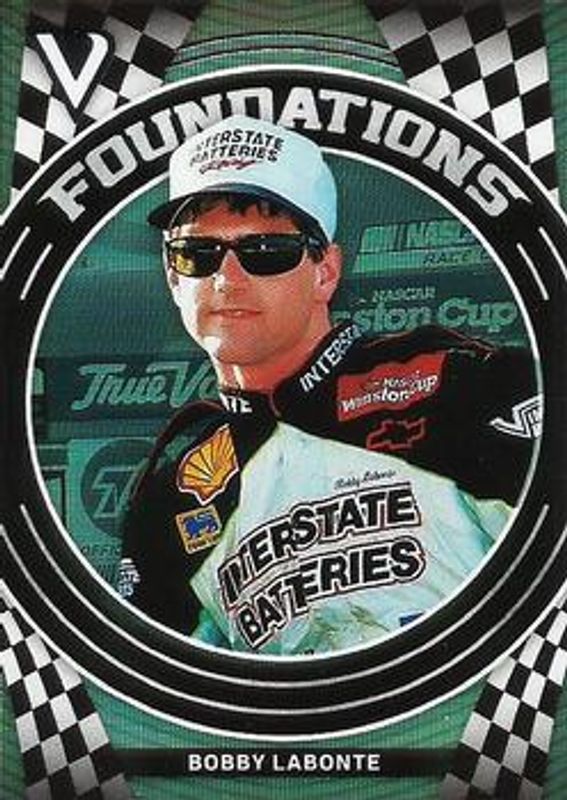 The Bobby Labonte 2018 Victory Lane NASCAR #F10 Foundations card is 1 of 37 Bobby Labonte's card variations in the 2018 Victory Lane NASCAR set being tracked by Sports Card Investor, including Champions, NASCAR at 70, Pedal to the Metal, Victory Marks /150, and Champions Gold /99.