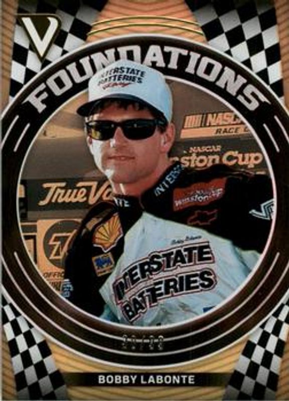 The Bobby Labonte 2018 Victory Lane NASCAR #F10 Foundations Gold /99 card is 1 of 37 Bobby Labonte's card variations in the 2018 Victory Lane NASCAR set being tracked by Sports Card Investor, including Champions, Foundations, NASCAR at 70, Pedal to the Metal, and Victory Marks /150.