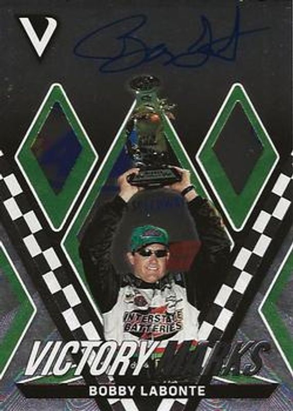 The Bobby Labonte 2018 Victory Lane NASCAR #VM-BL Victory Marks /150 card is 1 of 37 Bobby Labonte's card variations in the 2018 Victory Lane NASCAR set being tracked by Sports Card Investor, including Champions, Foundations, NASCAR at 70, Pedal to the Metal, and Champions Gold /99.