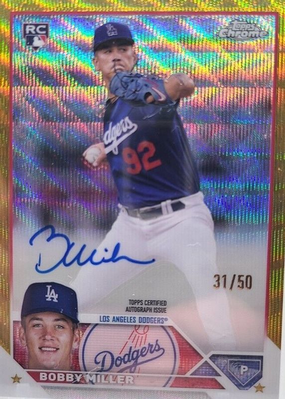 The Bobby Miller 2023 Topps Chrome Update #RA-BM Autographs - Gold Wave Refractor /50 Rookie card in Raw condition has not changed in price in the last 30 days and was last sold for $147.50 .