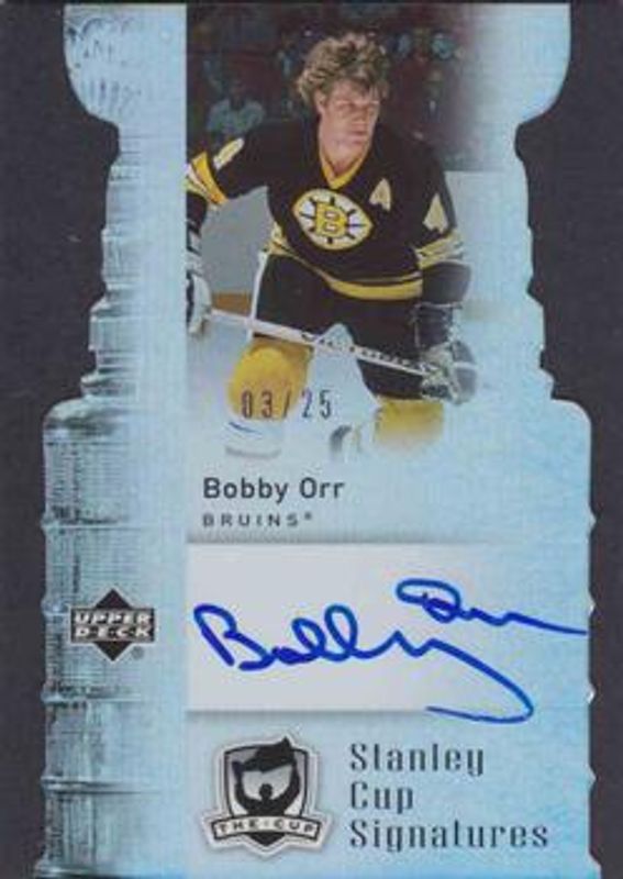 The Bobby Orr 2006 Upper Deck The Cup #CS-BO Stanley Cup Signatures /25 card is 1 of 16 Bobby Orr's card variations in the 2006 Upper Deck The Cup set being tracked by Sports Card Investor, including Base /249, Gold /25, Black Rainbow /1, Printing Plates Black /1, and Printing Plates Cyan /1.