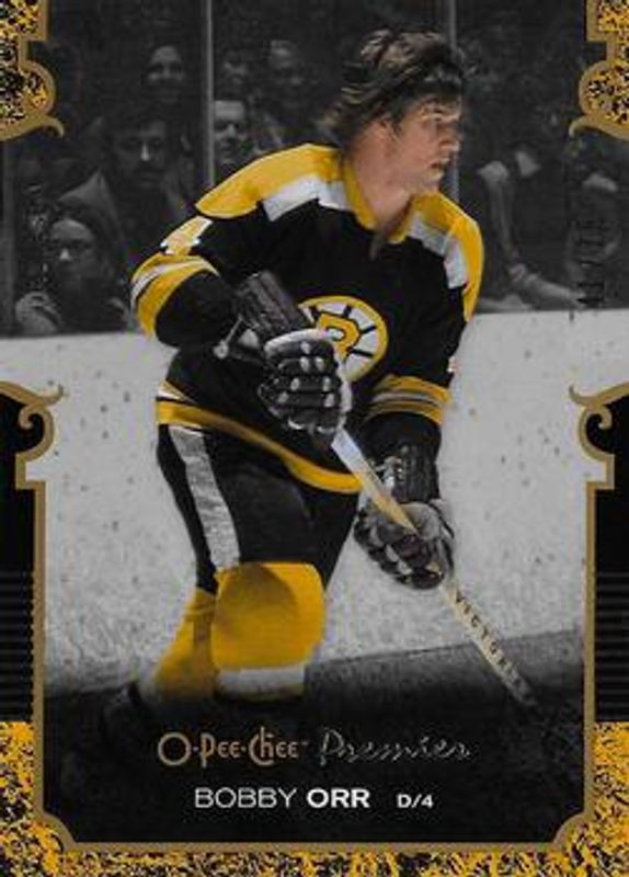 The Bobby Orr 2007 O-Pee-Chee Premier #4 Gold /50 card is 1 of 15 Bobby Orr's card variations in the 2007 O-Pee-Chee Premier set being tracked by Sports Card Investor, including Base /299, Silver Spectrum /35, Gold Spectrum /15, Black /1, and Stitchings /199.