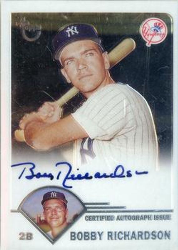 The Bobby Richardson 2003 Topps Retired Signature Edition #TA-BR Autographs card is 1 of 4 Bobby Richardson's card variations in the 2003 Topps Retired Signature Edition set being tracked by Sports Card Investor, including Base, Black /99, and Autographs - Refractor /25.