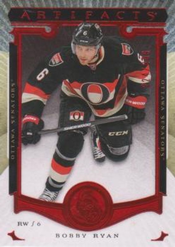 The Bobby Ryan 2015 Upper Deck Artifacts #29 Ruby /399 card is 1 of 13 Bobby Ryan's card variations in the 2015 Upper Deck Artifacts set being tracked by Sports Card Investor, including Base /899, Auto Materials Silver /125, Emerald /99, Sapphire /85, and Material Emerald /49.