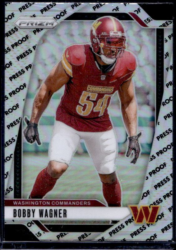 The Bobby Wagner 2024 Prizm #293 Press Proof /(SSP) card is 1 of 84 Bobby Wagner's card variations in the 2024 Prizm set being tracked by Sports Card Investor, including Base, Choice Blue Yellow Green, Choice Silver, Disco, and Green.
