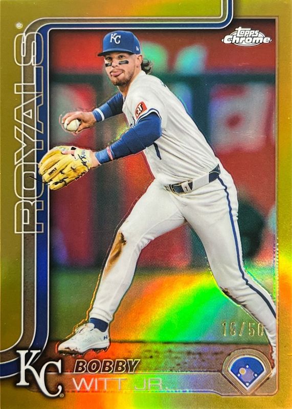 The Bobby Witt Jr. 2025 Topps Chrome #93 Gold Refractor /50 card in Raw condition has moved down -$123 (-54.4%) in the last 30 days and was last sold for $102.50 .