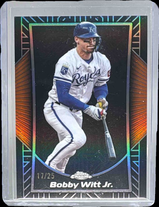 The Bobby Witt Jr. 2025 Topps Chrome #SE-10 Shadow Etch - Orange Refractor /25 card in Raw condition has not changed in price in the last 30 days and was last sold for $81.00 .
