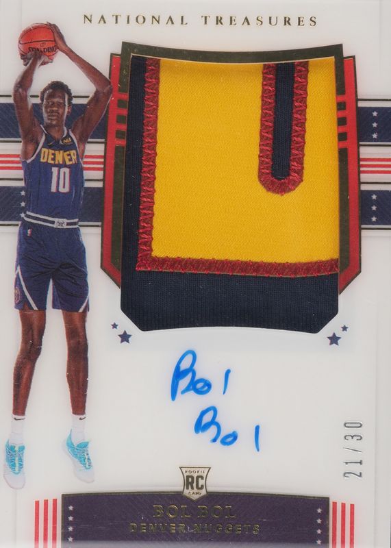 This card is 1 of 8 Bol Bol's card variations in the 2019 National Treasures set being tracked by Sports Card Investor, including Rookie Patch Auto /99, Rookie Patch Auto - Gold /10, Rookie Patch Auto - Emerald /5, Rookie Patch Auto - Stars & Stripes Blue /3, and Rookie Patch Auto - Logoman /1.