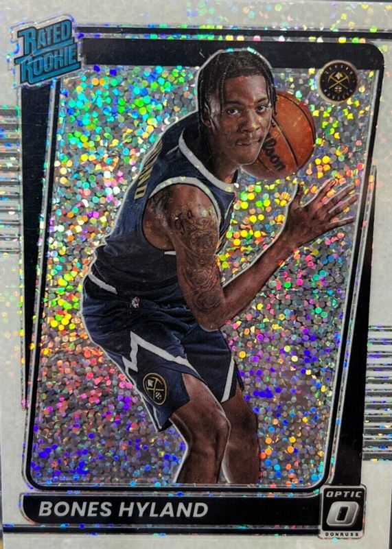 Bones Hyland's Basketball cards are available in at least 44 sets. Bones Hyland's biggest 7-day price movers are 2021 Optic #194 White Sparkle /(SSP), 2023 Impeccable #WCS-BHY 2022 Panini Impeccable Basketball Watercolor Signatures - Holo Silver /25, and 2023 Impeccable #WCS-BHY 2022 Panini Impeccable Basketball Watercolor Signatures /35.