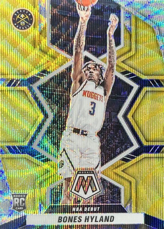The Bones Hyland 2021 Mosaic #271 NBA Debut - Gold Wave Rookie card in Raw condition has not changed in price in the last 30 days and was last sold for $3.00 .