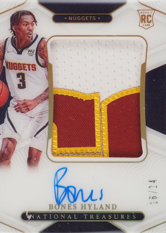 This card is 1 of 10 Bones Hyland's card variations in the 2021 National Treasures set being tracked by Sports Card Investor, including Rookie Patch Auto - Bronze (/49), Rookie Patch Auto - NBA 75th (/75), Rookie Patch Auto - Pink (/25), Rookie Patch Auto /99, and Rookie Patch Auto - Gold /10.
