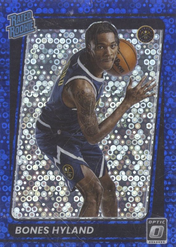 The Bones Hyland 2021 Optic #194 Fast Break Blue /50 Rookie card in Raw condition has not changed in price in the last 30 days and was last sold for $63.00 .