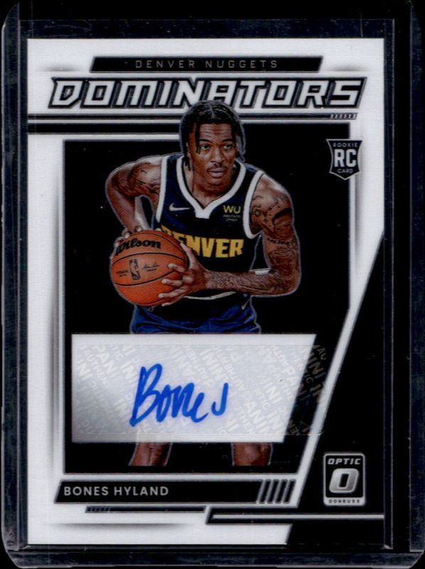 The Bones Hyland 2021 Optic #RD-NHY Rookie Dominators Signatures /99 card is 1 of 81 Bones Hyland's card variations in the 2021 Optic set being tracked by Sports Card Investor, including Base, Blue Pulsar, Blue Velocity, Checkerboard, and Choice.