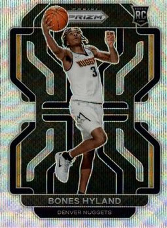 The Bones Hyland 2021 Prizm #302 Silver Wave Rookie card is 1 of 96 Bones Hyland's card variations in the 2021 Prizm set being tracked by Sports Card Investor, including Base, Blue NBA 75th Anniversary, Blue Wave, Choice Blue Yellow Green, and Factory Set Blue Hyper.