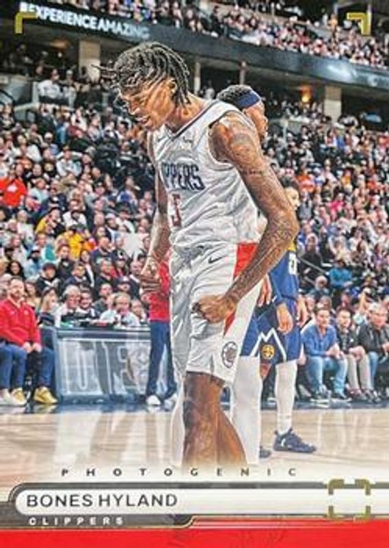 The Bones Hyland 2022 Photogenic #29 Base /999 card is 1 of 6 Bones Hyland's card variations in the 2022 Photogenic set being tracked by Sports Card Investor, including Silver /99, Diamond /75, Maze /25, Gold /10, and Platinum /1.