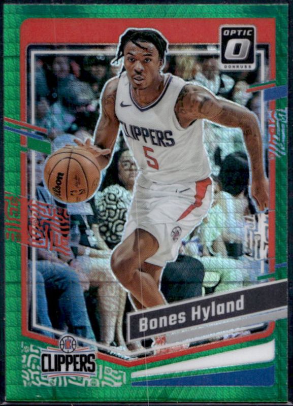 The Bones Hyland 2023 Optic #50 Hyper Green card is 1 of 55 Bones Hyland's card variations in the 2023 Optic set being tracked by Sports Card Investor, including Base, Blue Velocity, Checkerboard, Choice Red & Green, and Fast Break.