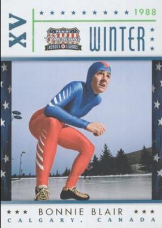 The Bonnie Blair 2012 Panini Americana Heroes & Legends #4 Olympics card is 1 of 18 Bonnie Blair's card variations in the 2012 Panini Americana Heroes & Legends set being tracked by Sports Card Investor, including Base, Elite Color Photo Signatures, Elite Color Photo /299, Elite Color Photo Materials /299, and Elite Signatures /165.
