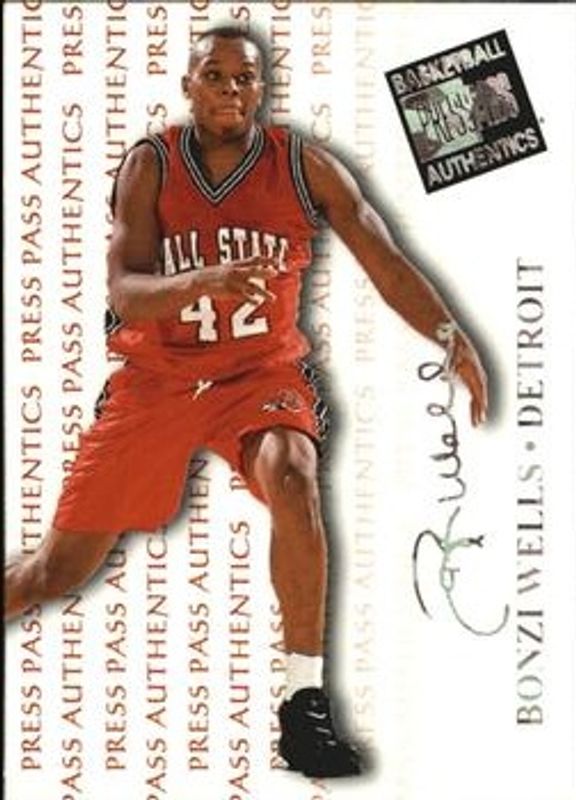 The Bonzi Wells 1998 Press Pass Authentics #9 Hang Time Rookie card is 1 of 2 Bonzi Wells' card variations in the 1998 Press Pass Authentics set being tracked by Sports Card Investor, including Base.