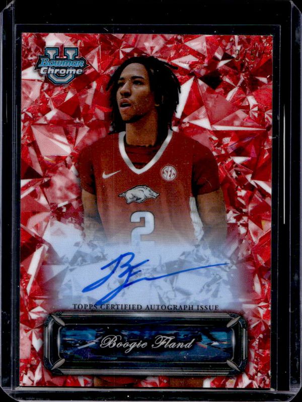 The Boogie Fland 2024 Bowman Chrome University Sapphire Edition #SSA-BF Sapphire Selections Autographs - Red Refractor /5 card is 1 of 28 Boogie Fland's card variations in the 2024 Bowman Chrome University Sapphire Edition set being tracked by Sports Card Investor, including Base, Purple Refractor /100, Yellow Refractor /75, Green Refractor /65, and Gold Refractor /50.