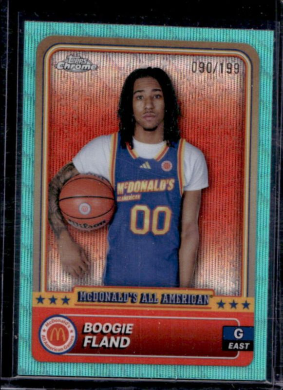 The Boogie Fland 2024 Topps Chrome McDonald's All-American #79 Aqua Wave Refractor /199 card is 1 of 112 Boogie Fland's card variations in the 2024 Topps Chrome McDonald's All-American set being tracked by Sports Card Investor, including #79 Base, #29 Base, #29 Blue RayWave Refractor, #79 Blue RayWave Refractor, and #29 McDonald's Logo Refractor.