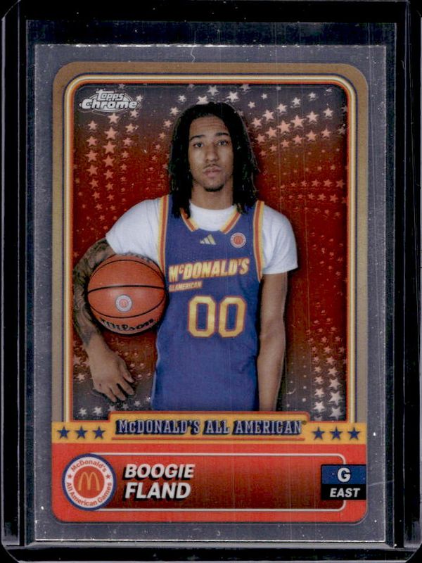 The Boogie Fland 2024 Topps Chrome McDonald's All-American #79 Base card is 1 of 112 Boogie Fland's card variations in the 2024 Topps Chrome McDonald's All-American set being tracked by Sports Card Investor, including #29 Base, #29 Blue RayWave Refractor, #79 Blue RayWave Refractor, #29 McDonald's Logo Refractor, and #79 McDonald's Logo Refractor.