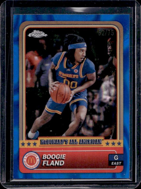 The Boogie Fland 2024 Topps Chrome McDonald's All-American #29 Blue Lava Refractor /75 card is 1 of 112 Boogie Fland's card variations in the 2024 Topps Chrome McDonald's All-American set being tracked by Sports Card Investor, including #79 Base, #29 Base, #29 Blue RayWave Refractor, #79 Blue RayWave Refractor, and #29 McDonald's Logo Refractor.