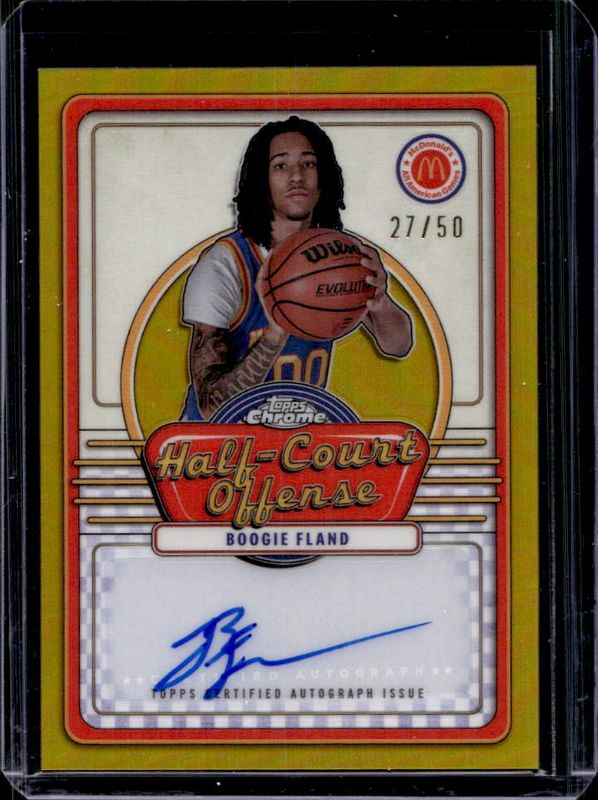 The Boogie Fland 2024 Topps Chrome McDonald's All-American #IML-JOH Half-Court Signatures - Gold Refractor /50 card is 1 of 112 Boogie Fland's card variations in the 2024 Topps Chrome McDonald's All-American set being tracked by Sports Card Investor, including #79 Base, #29 Base, #29 Blue RayWave Refractor, #79 Blue RayWave Refractor, and #29 McDonald's Logo Refractor.